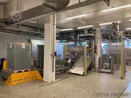 Overview The glass depalletizer was manufactured by the German company KHS in 2005 and was until recently part of a bottling line in a German dairy company. The palletizer is now being released as the owner is shutting down the production. Technical details/ scope Depalletizer with lift and discharge at the bottom With intermedeiate layer remover and magzine With slide for top layer/cover Enclosed conveyors can pull off single lane wise for shaped bottles Incl. protective fences, pallet transport, discharge table