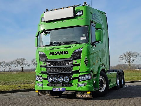 Number of axles: 3, Configuration: 6x4, Unladen weight: 9,915 kg, Gross vehicle weight: 29,000 kg, Total tank capacity: 790 litres, Second diesel tank, Fifth wheel height: 124 cm, Fifth wheel coupling: Fixed, Number of axle locks: 1, Alloy wheels, Suspension type: Air suspension, Cruise control, Mileage recorder (control device), Digital tachograph, Air conditioning, Parking air conditioning, Auxiliary heater, Colour: Green, Engine output: 397 kW (532 Hp), Euro standard: 6, Transmission type: Opti-cruise, Gears: 12, Clutch pedal, Additional braking system, Retarder brand: Scania, Power steering, ABS, ASR, R 540 A 6X4 NA / RETARDER / WB 315 / NIGHT AIRCO / LEATHER / GERMAN TRUCK